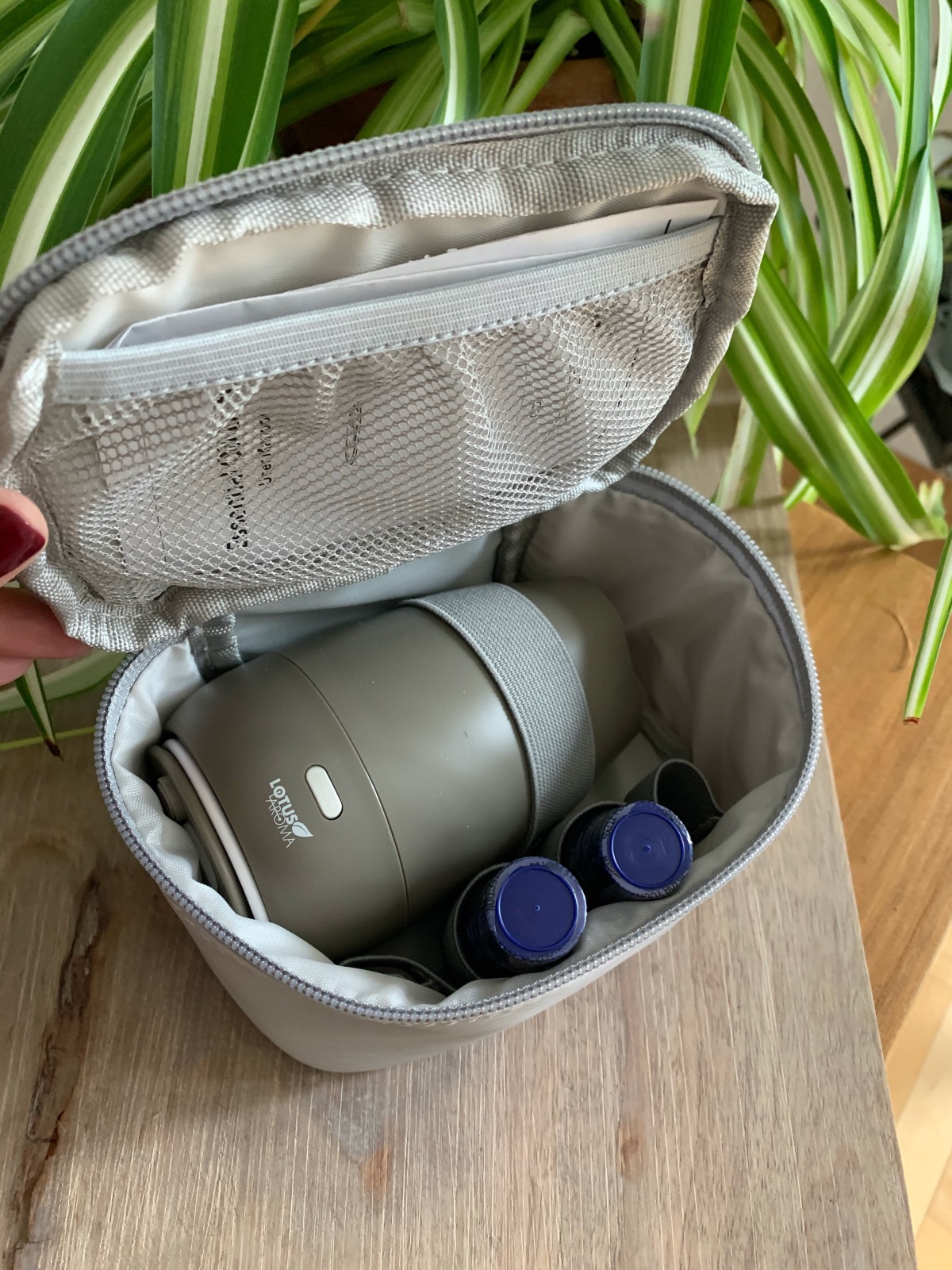 Je vous propose Lotus Aroma car comme vous le savez, je suis souvent en déplacement pour les tournages de Bien. Lorsque je suis seule dans ma chambre d’hôtel, j’ai souvent envie d’allumer une chandelle, mais par mesure de sécurité je ne le fais pas. Lotus Aroma a donc mis sur le marché ce merveilleux diffuseur ultrasonique portatif format voyage qui se charge à même une prise USB ! Super compact, il vient dans une pochette qui peut aussi contenir vos flacons d’huiles. C’est vraiment une super alternative à la chandelle et cela me permet d’avoir une odeur magnifique et apaisante même à l’extérieur de chez moi. Belle idée ! Le coffret vient avec deux huiles, le rafraichissante et purifiante citron et Lavandin Abrialis pour la relaxation.